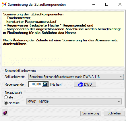 Die Summierung der Zulaufkomponenten wird vor jeder hydraulischen Berechnung automatisch für das gewählte Abwassernetz durchgeführt. Für diesen Vorgang wird der Dialog Summierung der Zulaufkomponenten mit den Netzparametern angezeigt.
