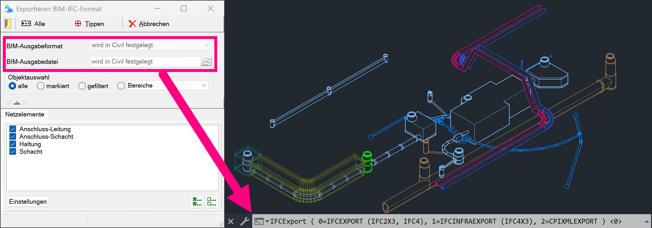- Exportieren, BIM IFC-Format: Unter Civil 3D kann jetzt bei installierter "Autodesk IFC 4.3 Extension" ausgewählt werden, ob über den klassischen IFCEXPORT (Schema 2x3 oder 4.0) oder IFCINFRAEXPORT (Schema 4x3) exportiert werden soll.