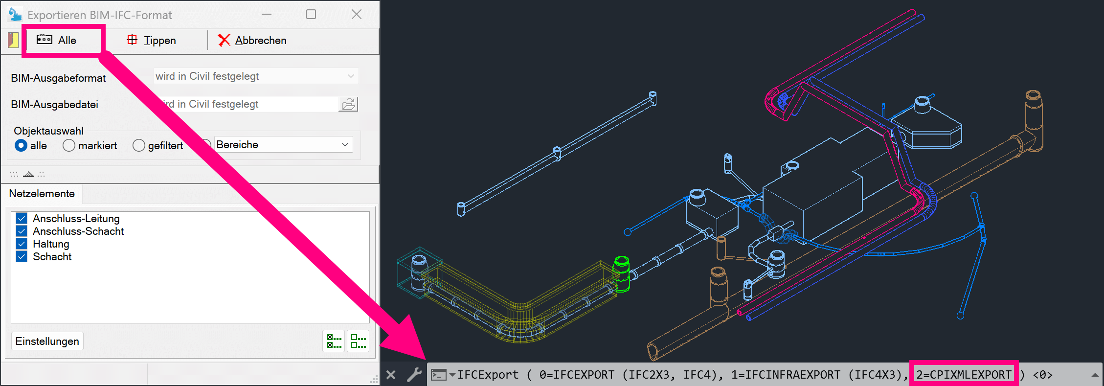 - Exportieren, BIM IFC-Format: Unter Civil 3D ist jetzt auch der Export nach cpixml möglich (vorausgesetzt wird die Installation der cpixml Extension unter Civil 3D).