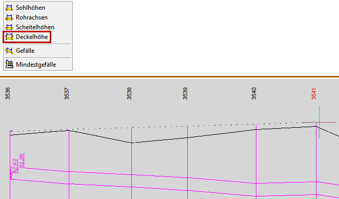 - Kanal: LS-Entwurf, Verbinden, Deckelhöhe: Man kann nun im LS-Entwurf alle Deckelhöhen zwischen zwei Schächen verbinden/interpolieren. Screenshot