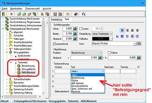 - Kanal: Netztypeinstellungen-Einzugsgebiete: Der Befestigungsgrad und die Versickerungsrate sind jetzt als Standardattribute zum Anschrieb verwendbar. Screenshot