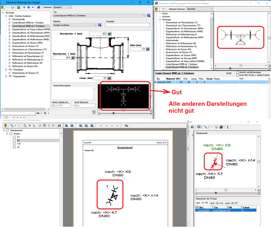 - Leitung: Material-Datenbank, Formstückdarstellung: Darstellung der neuen Combielemente als Detailgrafik verbessert. Screenshot