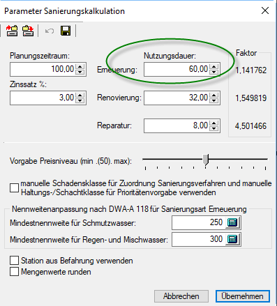 - Kanalsanierung: Für die Kostenvergelichsrechnung kann jetzt ein abweichender Planungszeitraum verwendet werden. Die Nutzungsdauer für die Erneuerung wird jetzt separat angegeben. Screenshot
