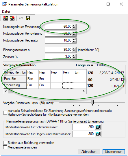 - Kanalsanierung: Variable Definition von Vergleichsvarianten (entsprechend LAWA, Prof. Schmidtke) implementiert, sowie die spezifische Angabe des Untersuchungszeitraumes (Planungszeitraumes). Screenshot