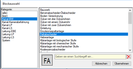 - Kanal + Leitung: Dialog zur Auswahl von Symbolen (Blöcken) enthält jetzt eine Sortierung nach Kategorie, eine Voransicht und eine Suchmöglichkeit. Screenshot