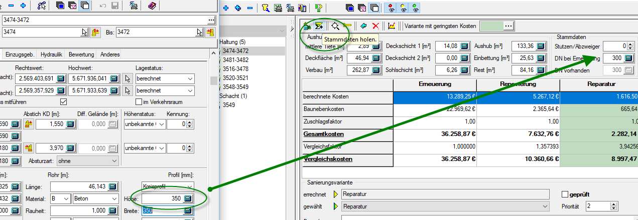- Kanalsanierung: Sanierungskalkulation: Funktion zum Aktualisieren der Stutzen-und Abzweiger umbenannt in "Stammdaten holen". Hier wird jetzt auch die "DN bei Erneuerung" geändert, wenn sich die Nennweite in den Stammdaten vergrößert hat. Screenshot