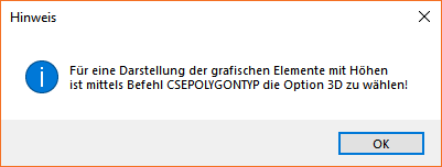 - Kanal + Leitung: Einstellungen, Allgemein, Lageplan: Wird die grafische Darstellung auf "erhalten Höhe" gesetzt kommt beim Übernehmen jetzt der zusätzliche Hinweis die Einstellung CSEPOLYGONTYP anzupassen. Screenshot