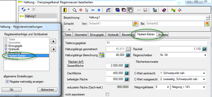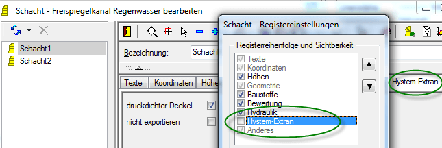- Kanal: Datenbank, Haltung: Neues Register 'Hystem-Extran' (standardmäßig deaktiviert). Hier werden Daten verwaltet, die für die Hystem-Extran-Schnittstelle verwendet werden. Screenshot