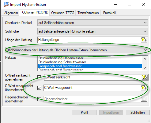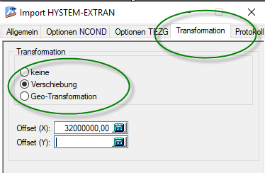 - Kanalplanung: Importieren, Hystem-Extran: Beim Import wird jetzt die Möglichkeit einer Transformation unterstützt. Screenshot