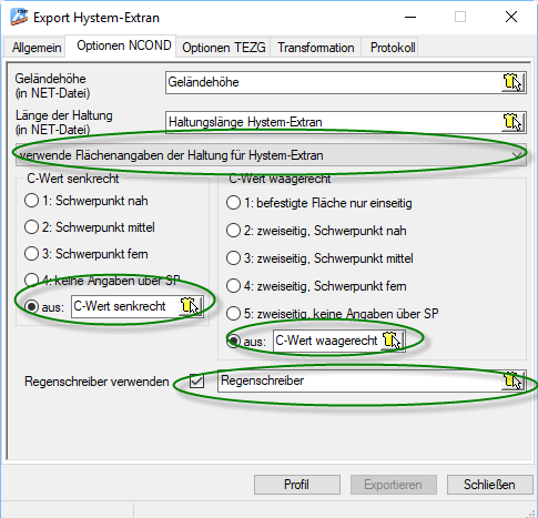 - Kanal: Exportieren, Hystem-Extran, Register Optionen NCOND: Hier werden jetzt die neuen Attribute für die Lage des Flächenschwerpunktes und Regenschreiber verwendet. Für die Übernahme der Flächengrößen kann jetzt zusätzlich gewählt werden, ob diese aus den Flächenangaben der Haltung für Hystem-Extran verwendet werden sollen. Screenshot
