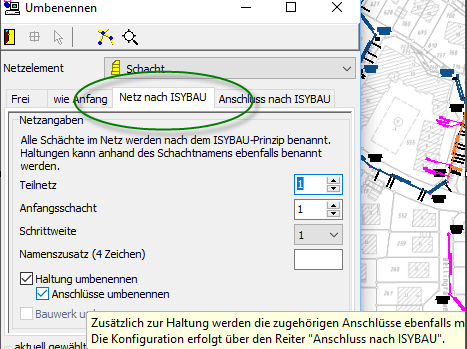 - Kanalplanung: Bearbeiten, Umbenennen: Neue Funktion zum Umbenennen eines ganzen Netzes nach den ISYBAU-Vorgaben. Screenshot