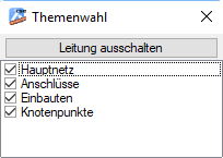 - Leitung: Schnellzugriff, Themenwahl: Mit dieser Funktion können sehr schnell und einfach grafische Teilbereiche ein- und ausgeblendet werden. Dabei werden Layereinstellungen vorgenommen, die ebenfalls über Einstellungen, Netztyp vorgenommen werden können, dort aber einzeln für jeden Netztyp und alle zugeordneten Elemente. Screenshot