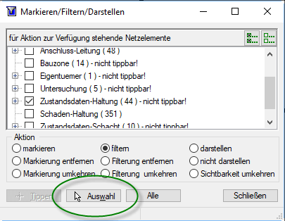 - Kanalkataster: Bearbeiten, Markieren/Filtern/Darstellen: Neue Auswahlmöglichkeit hinzugefügt. Dies ist auch zur Bearbeitung 'nicht tippbarer' Elemente sinnvoll. Screenshot