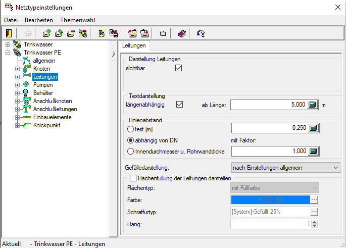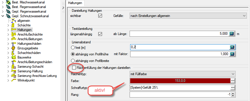 - Kanal + Leitung: Einstellungen, Netztyp: Für Haltungen/Leitungen/Anschlussleitungen werden die Einstellungen für die Flächenfüllung jetzt nur aktiv, wenn sie auch gesetzt werden können (Linienabstand nicht 0, Flächenfüllung an). Screenshot