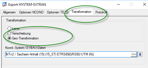 - Kanal: Exportieren, HYSTEM/EXTRAN: Jetzt mit Transformationsmöglichkeit. So lassen sich z.B. Elemente mit UTM-Koordinaten mit Zonenwert in eine für die NET-Datei verwendbare Koordinatengröße transformieren. Screenshot