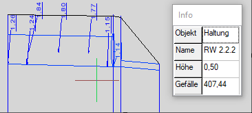 - Kanal + Leitung: Darstellen, LS-Entwurf: Beim Arbeiten im Längsschnitt werden jetzt während der Konstruktion wichtige Elementeigenschaften in einem Info-Fenster angezeigt. Screenshot