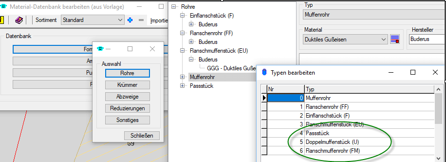 - Leitungsplanung: Verwalten-Material-DB, Formstücke, Rohre: Die Typen Doppelmuffenstück (U) und Flanschmuffenrohr (E) hinzugefügt. Screenshot