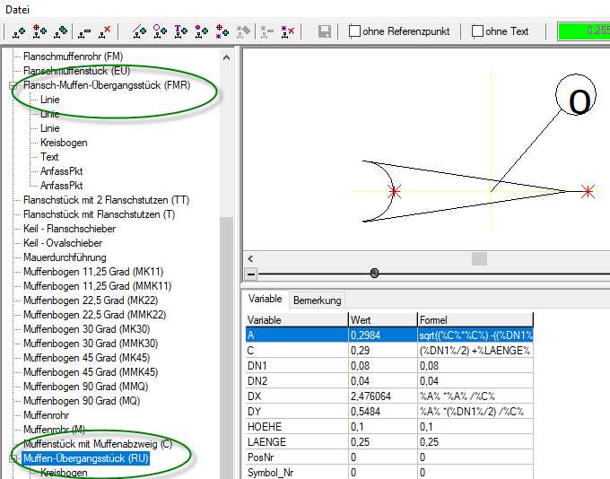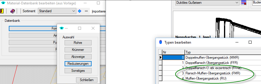 - Leitungsplanung: Verwalten, Material-DB, Formstücke, Reduzierungen: Typen Flansch-Muffen-Übergangsstück (FMR) und Muffen-Übergangsstück (RU) hinzugefügt. Screenshot