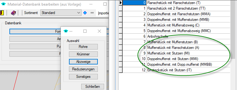 - Leitungsplanung: Verwalten, Material-DB, Formstücke, Abzweige: Typenliste ergänzt um B-, A-, MI-, MMI-, MMBB- und IT-Stück. Screenshot