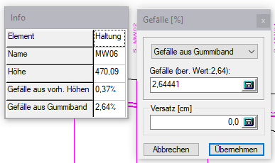 - Kanal + Leitung: Darstellen, LS-Entwurf: Die Funktion Verbinden->Gefälle besitzt nun einen Informationsdialog, der auch die aktuellen Gefällewerte anzeigen. Der Gefälle-Dialog hat nun die Option, zwischen dem Gefällewert der vorhandenen Elemente und dem des Gummibandes zu wechseln. Screenshot