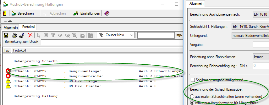 - Kanalplanung: Aushubberechnung: Bei der Einstellung 'Schachtbaugrube immer aus Vorgabewerten' wird jetzt geprüft, ob hier gültige Werte vorhanden sind. Screenshot
