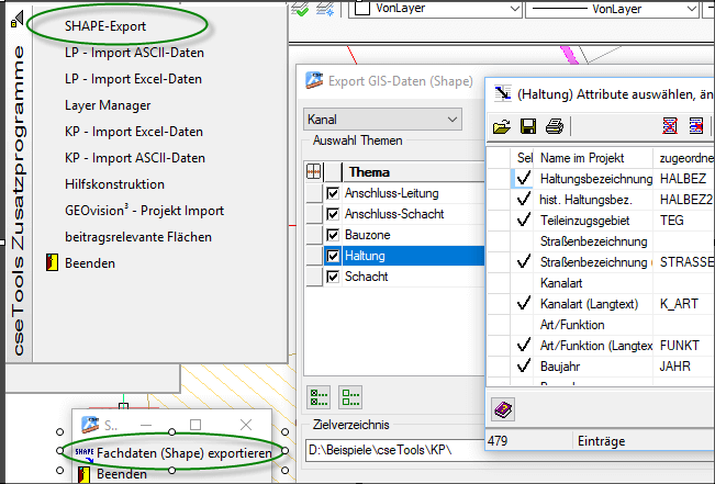 - cseTools: AddOn Shape-Export implementiert: Damit ist es möglich Daten aus dem Bereich Kanal oder Leitung ins Shape-Format zu übertragen. Screenshot