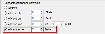 - Kanal + Leitung: Unter [Einstellungen]->[Netztyp] kann man nun im Reiter [Schächte/Anschlussschächte] bzw. [Knoten/Anschlussknoten] bei der Darstellung der Bezeichnungen eine weitere Option auswählen. Es ist jetzt möglich, sich nur die letzten (beliebig festlegbaren) Stellen des Namens anzuzeigen. Screenshot