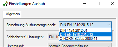 - Kanal + Leitung: Aushubberechnung: Kompatibilität der Berechnung zur aktuellen DIN EN 1610 geprüft. Bei der Auswahl und Anzeige der Berechnungsgrundlage wird jetzt der Stand der Norm mit angegeben. Screenshot