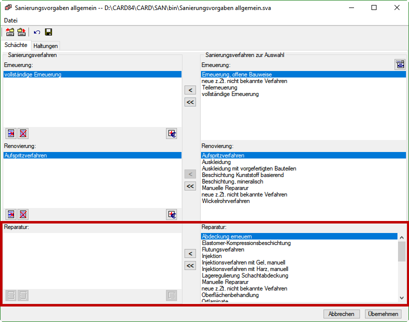 - Kanalsanierung: Verwalten, Sanierungsvorgaben allgemein: Es ist nun auch möglich Verfahren für die Reparatur vorzugeben. Screenshot