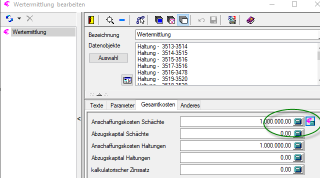 - Kanalkataster: Auswerten, Wertermittlung: Bei der Berechnung der Herstellkosten (Umlegung der Gesamtkosten auf die Netzelemente) ist jetzt ein Laufbalken (Prozessanzeige) eingebaut. Screenshot