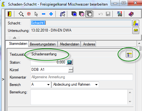 - Kanalkataster: Datenbank, Schachtschaden: Hier erfolgt jetzt wie schon bei den Haltungsschäden eine Anzeige ob es sich um einen Punktschaden, Streckenschden oder ein Steuerkürzel handelt. Ist der aktuelle Schaden ein Streckenschaden, so kann direkt zu diesem gesprungen werden. Screenshot