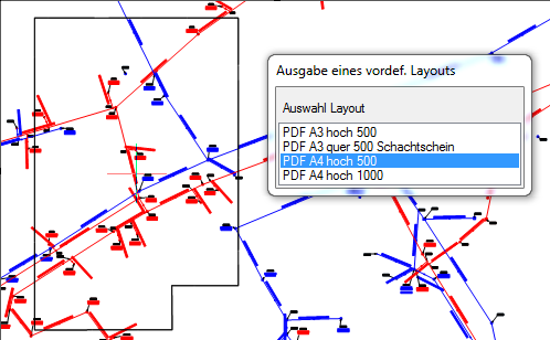 - Kanal + Leitung: Schnellzugriff, Ausgabe Layout: neue Funktion mit der das auszugebenede Layout unter Berücksichtigung des Maßstabes grafisch festgelegt werden kann und der entsprechende Bildausschnitt automatisch im Layout gesetzt und dieses aktiviert wird. Screenshot