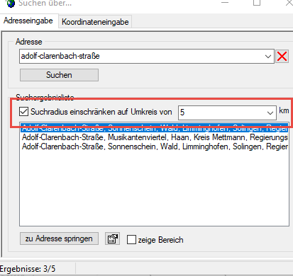 - Leitungskataster: Es ist nun möglich die Ergebnisse der Websuche zu filtern. Man kann bei der Suche nun den Umkreis des aktuellen Ausschnittes angeben in dem sich die Ergebnisse befinden sollen. Screenshot