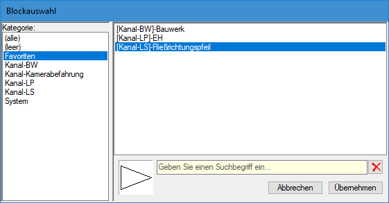 - Kanal + Leitung: Im Symbolauswahldialog können nun Favoriten gesetzt werden. In der Liste der Symbole erscheint bei einem [Rechtsklick] die Option [zu Favoriten hinzufügen]. Ein Klick auf diese Option fügt das Symbol dann dem Eintrag [Favoriten] hinzu. Auf die selbe Art und Weise kann der Favorit auch wieder entfernt werden. Screenshot