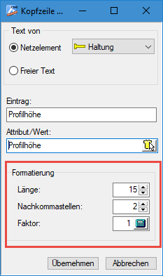 - Kanal + Leitung: Einstellungen, Netztyp, Textanordnung, Formatierung (numerische Werte) Gibt man bei der Länge eine "3" ein, aktualisiert anschließend den Lageplan und öffnet die Formatierungseinstellungen neu, dann setzt sich der Wert für "Länge" auf 15 zurück -> korrigiert