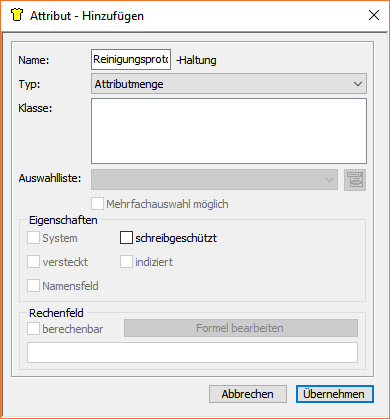 - Kanalkataster: Verwalten, Klasseneditor, Attribut hinzufügen: Man kann nun das Eingabefeld für den Namen bei Verwendung des Typs "Attributmenge" vergrößern. Screenshot