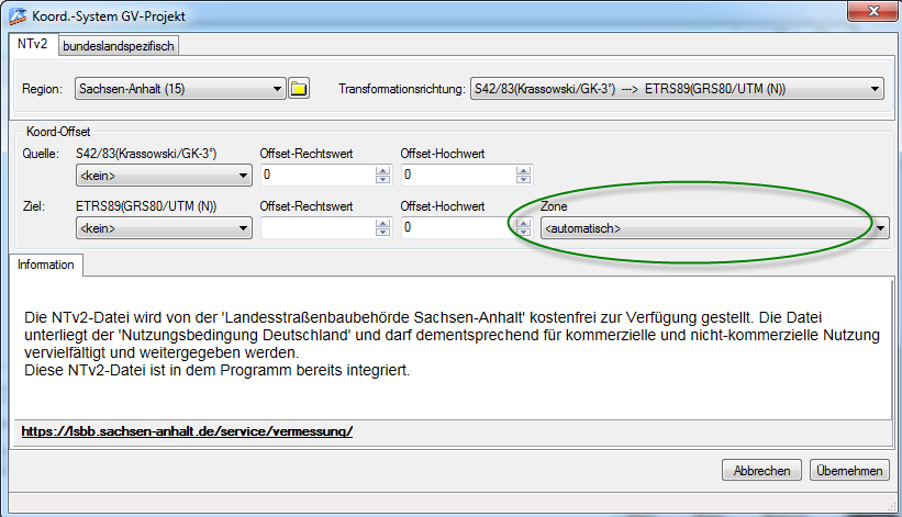 - cseTools: Koordinatentransformation: Bei der NTv2-Transformation nach UTM kann jetzt die gewünschte Zone eingestellt werden. Dies ist dann hilfreich, wenn eine abweichende Zone gewünscht ist. bedeutet dabei dass die Zone auf Basis der Ausgangskoordinaten gewählt wird. Dies entspricht dem bisherigen Vorgehen. Screenshot