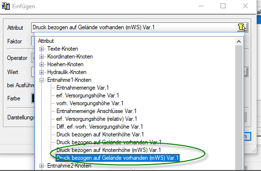 - Leitungsplanung: Zusätzliche Attribute zur Beschriftung an Knoten/Leitung: Beschriftungsmöglichkeit des berechneten Drucks an Knoten/Leitung im Lageplan in der Einheit "mWS" (Meter Wassersäule). Screenshot