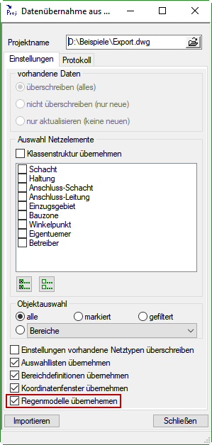 - Kanalplanung: Kanal Projektimport hat nun die Wahlmöglichkeit Regenmodelle zu übernehmen. Screenshot