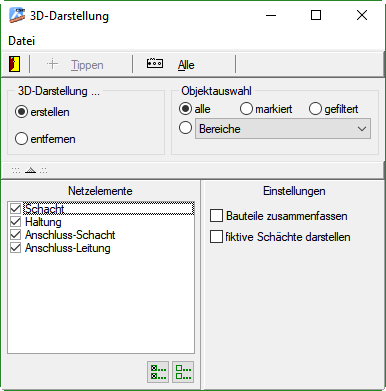 - Kanal + Leitung: Darstellen, Netz in 3D: Man kann nun die 3D-Darstellung über einen Dialog steuern. Screenshot