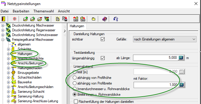 - Kanal: Einstellungen, Netztyp, Haltungen, Linienabstand: Wenn man von 'Innendurchmesser u. Rohrwanddicke' auf eine andere Option zurückschaltet, verschwindet die Doppellinendarstellung nicht. -> korrigiert