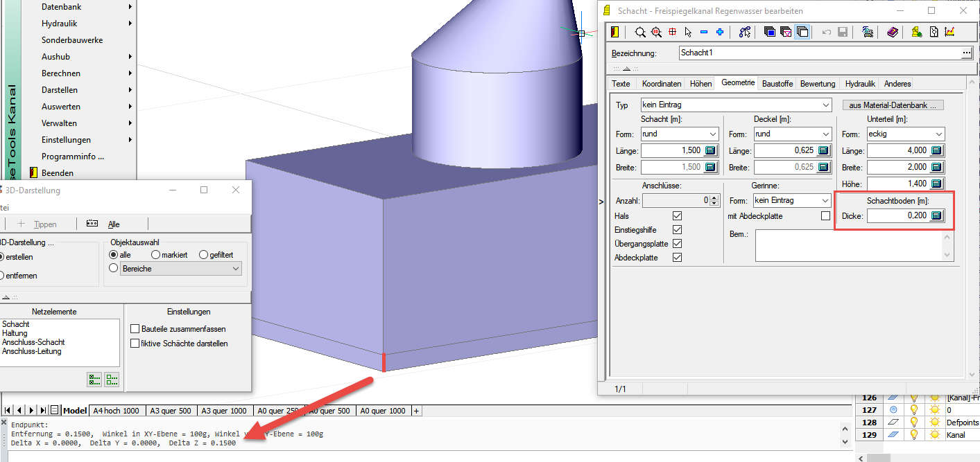 - Kanal: Darstellen, Netz in 3D: Es wird nun der Schachtboden berücksichtigt und auch als Volumenkörper dargestellt. Screenshot
