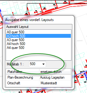 - Kanalkataster: Schnellzugriff: Layout ausgeben. Hier besteht jetzt zusätzlich die Möglichkeit einen Maßstab auszuwählen. Ändert man den Maßstab, so wird dieser automatisch im gewählten Layout gesetzt. Außerdem werden Symbole mit dem Namen "Massstabsleiste" automatisch mit skaliert. Screenshot