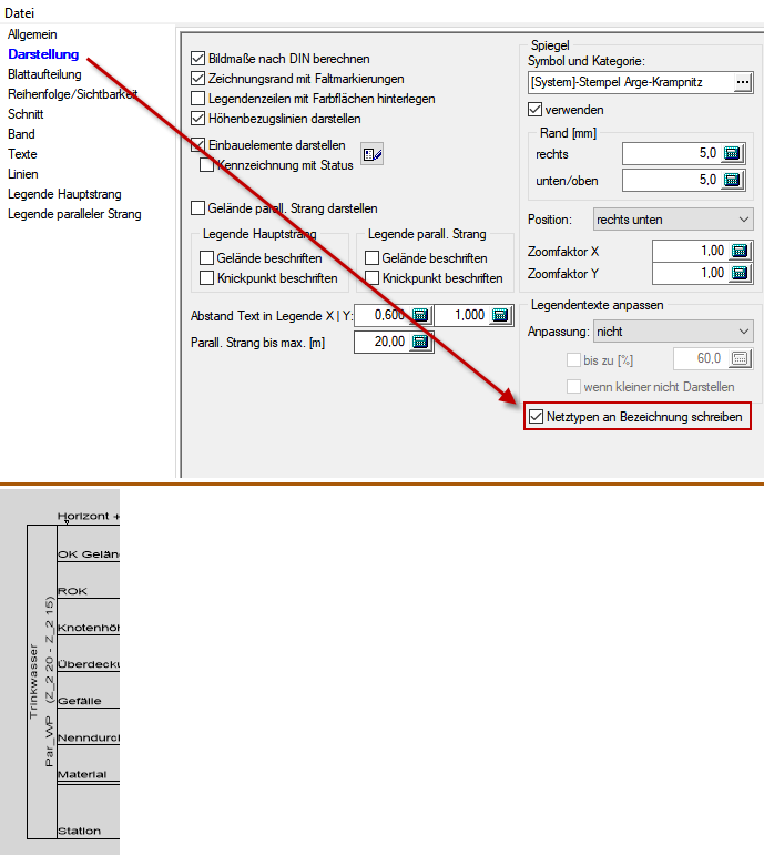 - Darstellen, Längsschnitt zeichnen: Es können nun die Netztypen der Elemente im Strang an die Bezeichnung mit angeschrieben werden. Screenshot