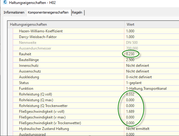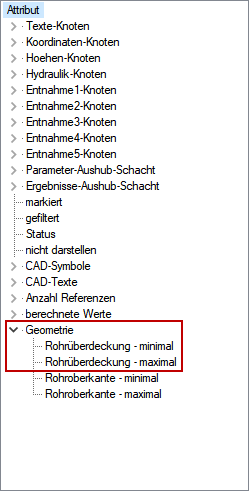 - Knoten: Die Attribute "Rohrüberdeckung - minimal" und "Rohrüberdeckung - maximal" (nur lesend) wurden hinzugefügt. Dabei wird aus allen am Knoten angeschlossenen Leitungen die kleinste/größte Rohrüberdeckung ermittelt. Screenshot