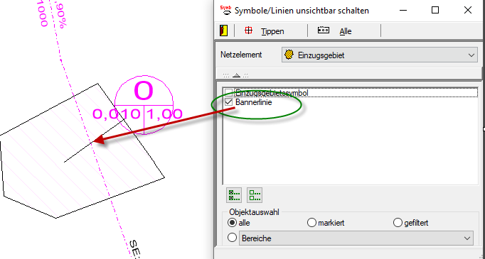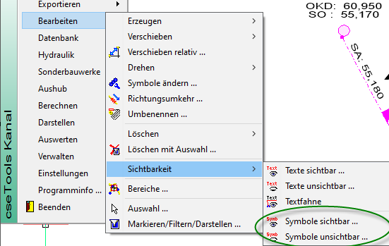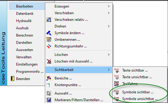 - Bearbeiten, Sichtbarkeit: Neue Funktionen für die Sichtbarkeit (an/aus) von Symbolen/Linien verfügbar. Die bisherigen einzelnen Funktionen, z.B. Sichtbarkeit Schachtdeckel wurden aus dem Menü entfernt, sind aber als Befehle über Werkzeugleisten weiterhin verfügbar. Screenshot
