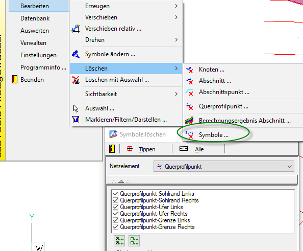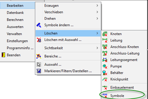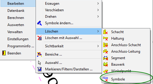 - Bearbeiten, Löschen: Neue Funktion für das Löschen von Symbolen/Linien verfügbar. Die bisherigen einzelnen Funktionen, z.B. Löschen 'Schacht an Knoten' wurden aus dem Menü entfernt, sind aber als Befehle über Werkzeugleisten weiterhin verfügbar. Screenshot