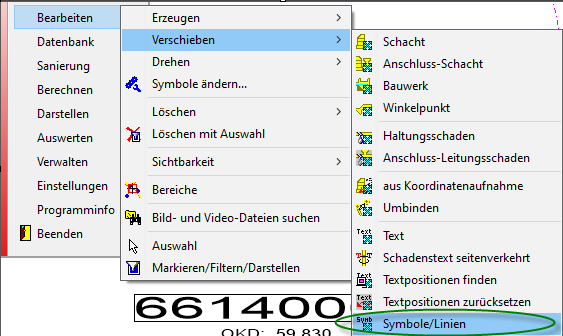 - Bearbeiten, Verschieben: Neue Funktion für das Verschieben von Symbolen/Linien verfügbar. Die bisherigen einzelnen Funktionen, z.B. Verschieben Schachtdeckel wurden aus dem Menü entfernt, sind aber als Befehle über Werkzeugleisten weiterhin verfügbar. Screenshot