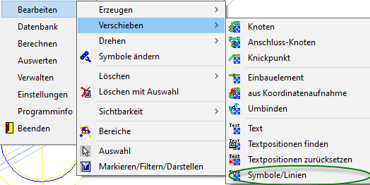 - Bearbeiten, Verschieben: Neue Funktion für das Verschieben von Symbolen/Linien verfügbar. Die bisherigen einzelnen Funktionen, z.B. Verschieben 'Schacht an Knoten' wurden aus dem Menü entfernt, sind aber als Befehle über Werkzeugleisten weiterhin verfügbar. Screenshot