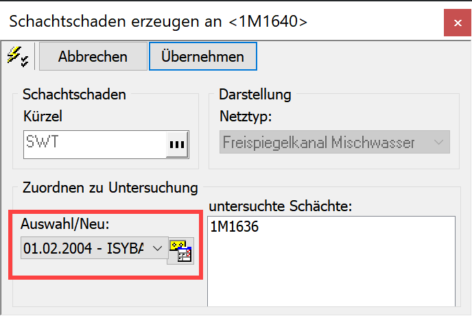 - Bearbeiten, Erzeugen, Schacht-/Haltungsschaden: Die zuletzt eingestellte Untersuchung wird sich nun gemerkt und beim erstmaligen Erzeugen von Schäden am Schacht/ Haltung automatisch eingestellt. Screenshot